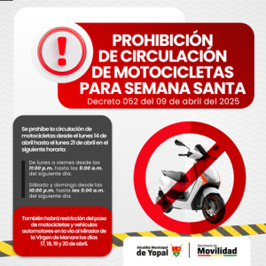 Se expidió el decreto que prohibe la circulación de motociclistas, en horas nocturnas, en la semena Santa en Yopal, así se informó por parte del secretario de movilidad Ricardo Camargo.